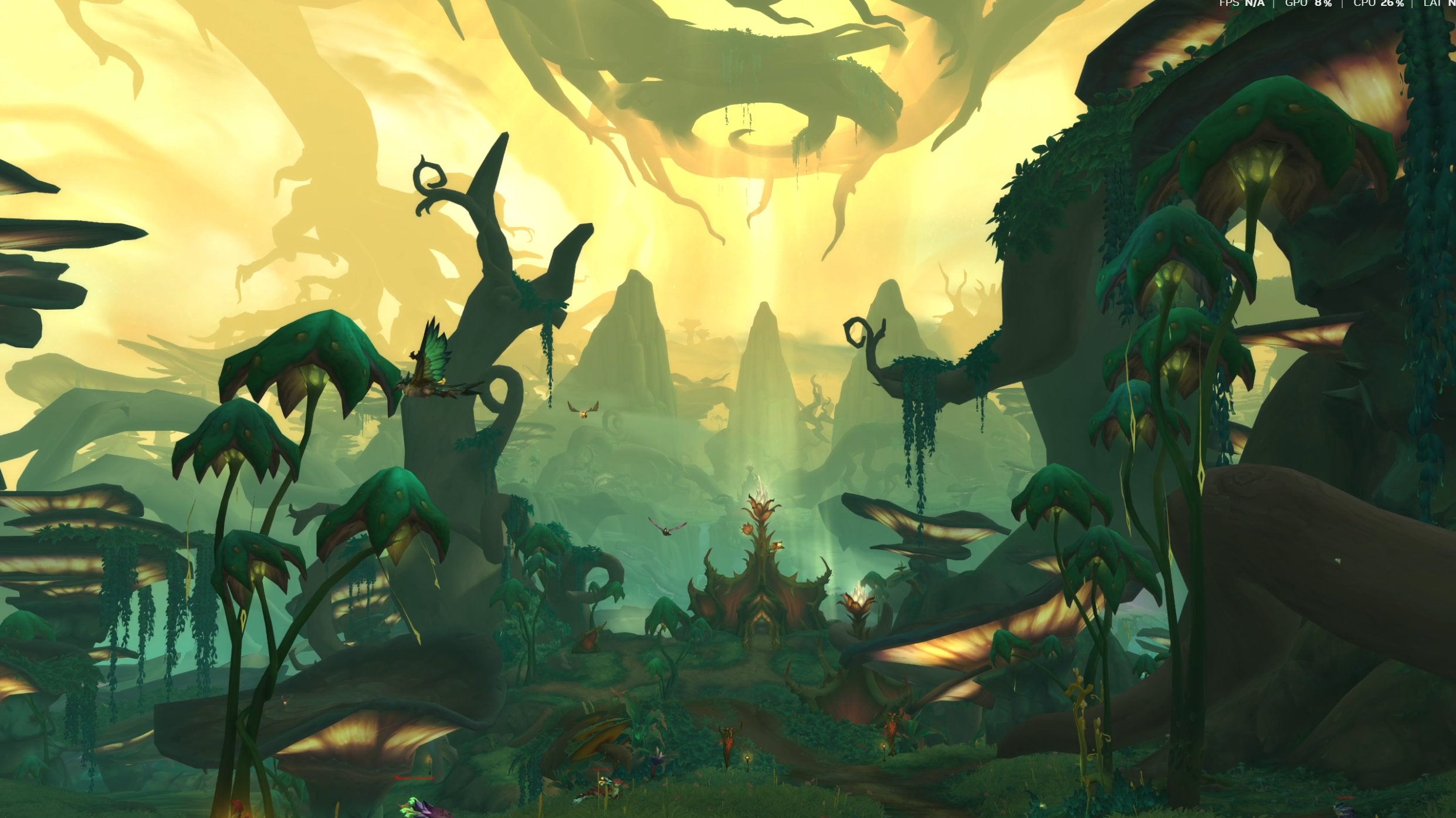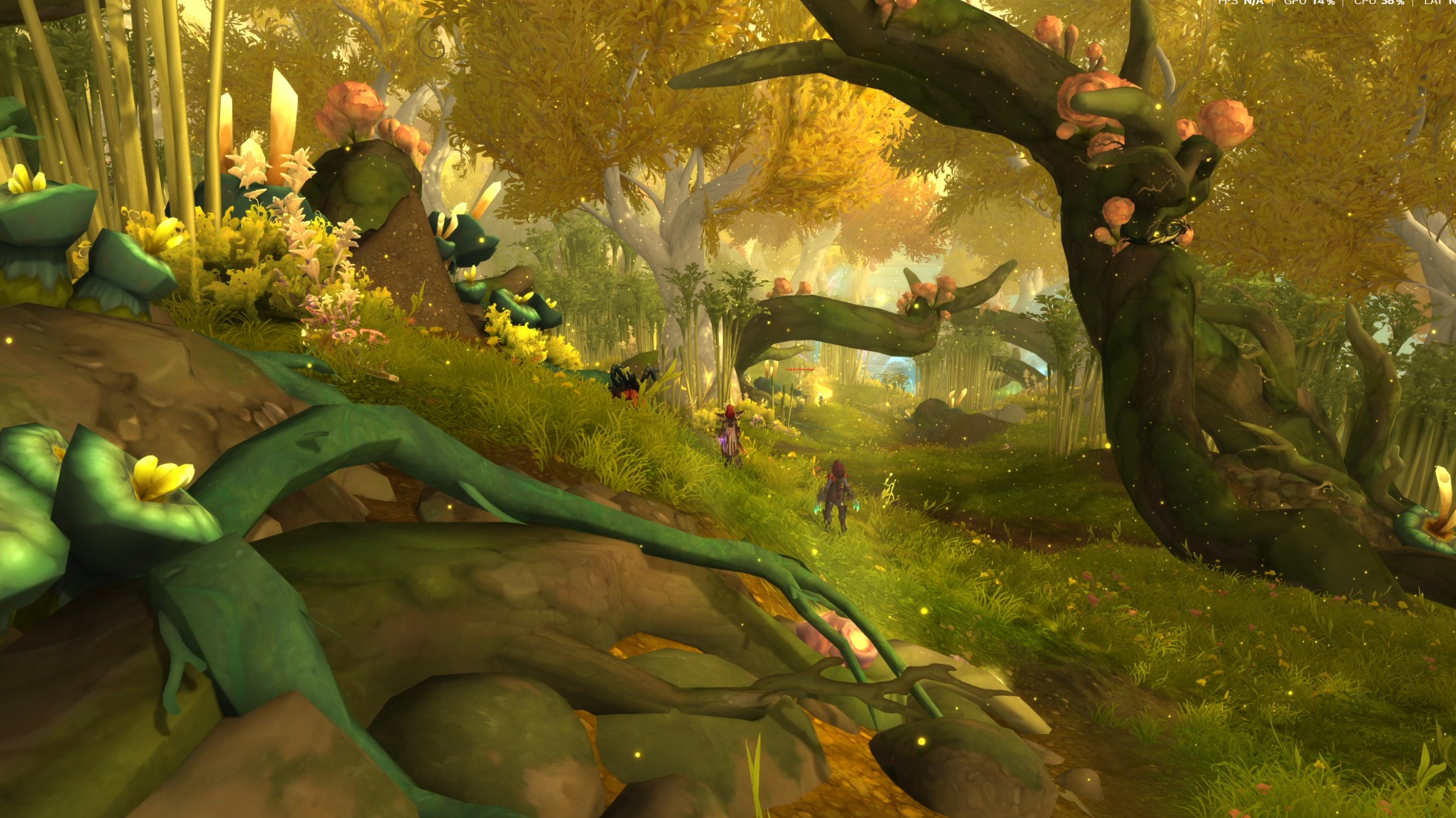 L'un des points forts de Midnight, comme c'est presque toujours le cas avec les extensions de WoW, réside dans la qualité de ses environnements. Les trois premières zones proposent une bonne variété : le Bois des Chants éternels alterne entre ambiances automnales et printanières autour d'une Lune-d'Argent entièrement reconstruite ; Zul'Aman offre une jungle tropicale animée de cascades et de ruines amani - dont j'apprécie particulièrement l'architecture ; Harandar se distingue par sa végétation bioluminescente et sa verticalité ; la Tempête du Vide, enfin, constitue la zone antagoniste, plus oppressante mais moins inventive visuellement car trop rébarbative (des cailloux violets, des monstres violets, de la végétation violette, un ciel violet...)